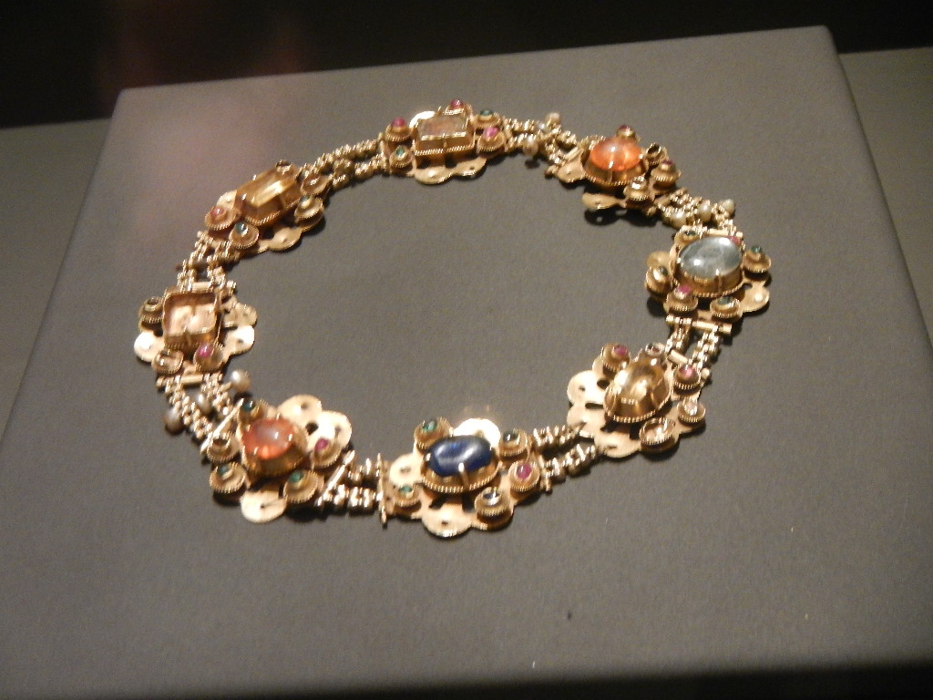 Colar, com safiras, esmeraldas, topázio, em ouro, que terá sido usado pela Rainha Santa. Museu Machado de Castro, em Coimbra.
